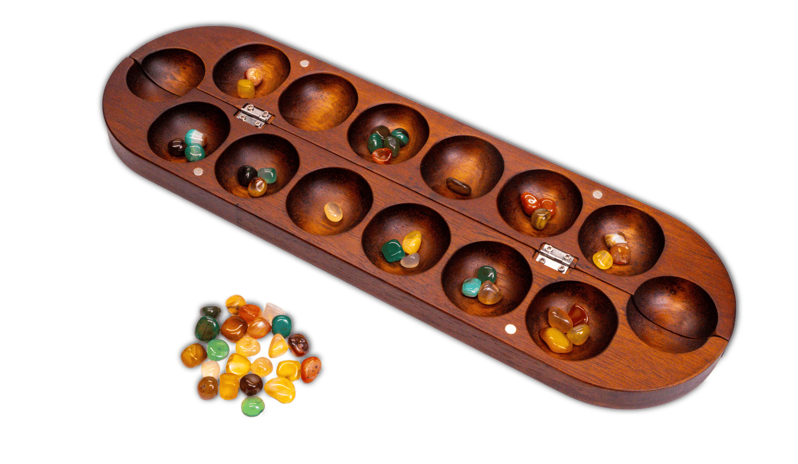 Hagyomány, szépség és stratégia – mindez egy fából készült, gyönyörű színes gyöngyökkel díszített, grandiózus Mankala játékban.